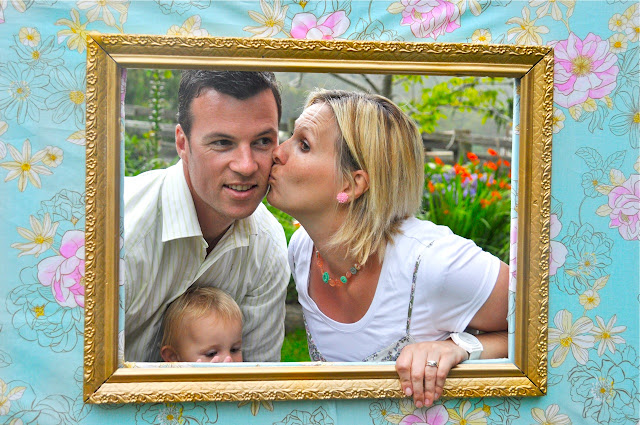 At the wedding, Sam's very clever Dad built a couple of super cool Photobooth Walls. Wooden panels with a "window" cut for a frame, covered with fabric and old photo frames - they were a hit!